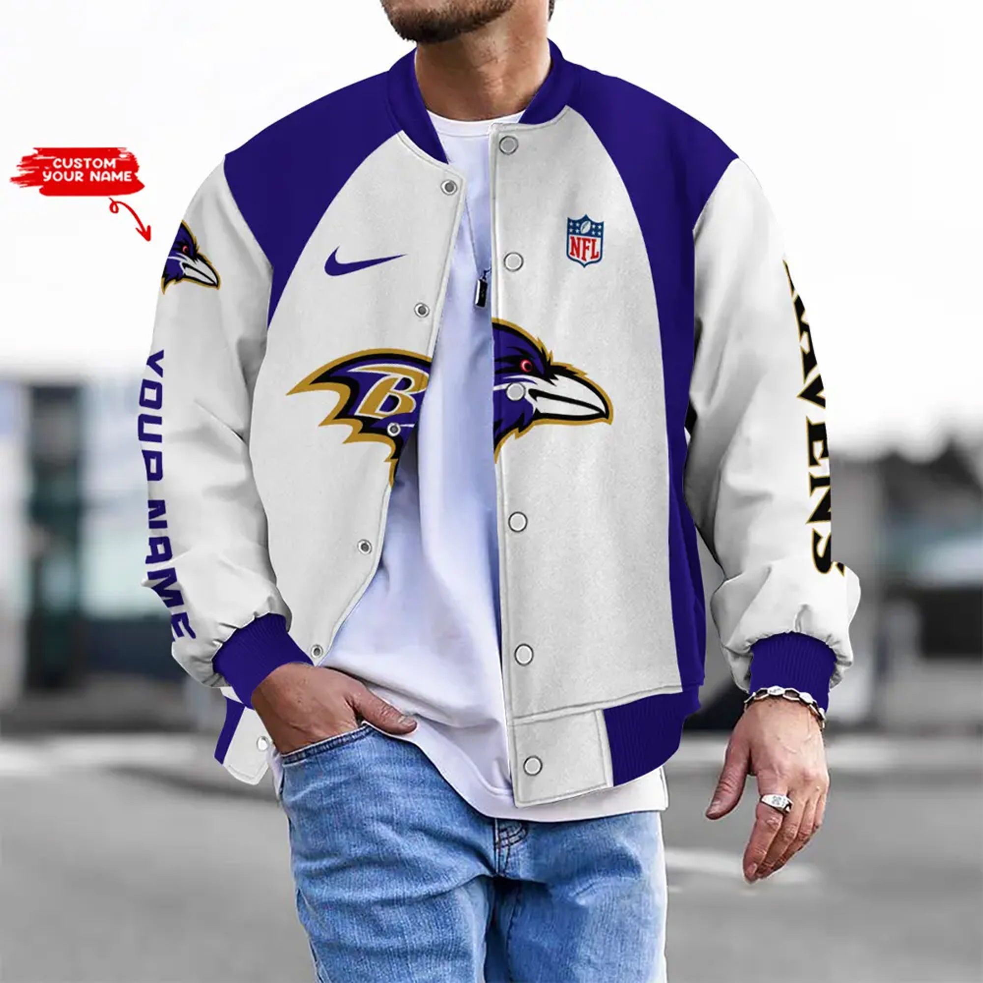 Customize Your Name With Baltimore Ravens Button Down Baseball Varsity Bomber Jacket