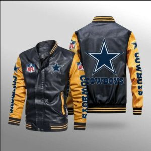 - This llight-weight Cowboys leather jacket with a high collar, full-zip front, and side seam pockets completes a stylish look for cool weather.