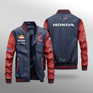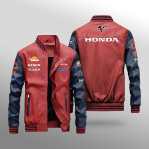 - This llight-weight Honda leather jacket with a high collar, full-zip front, and side seam pockets completes a stylish look for cool weather.